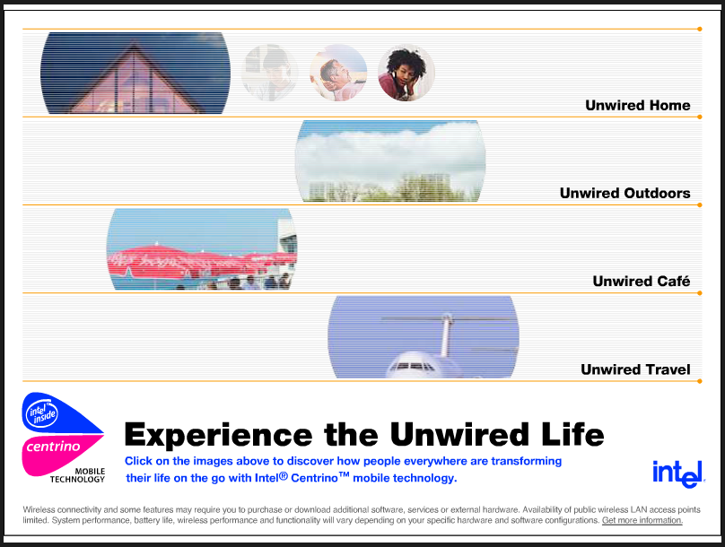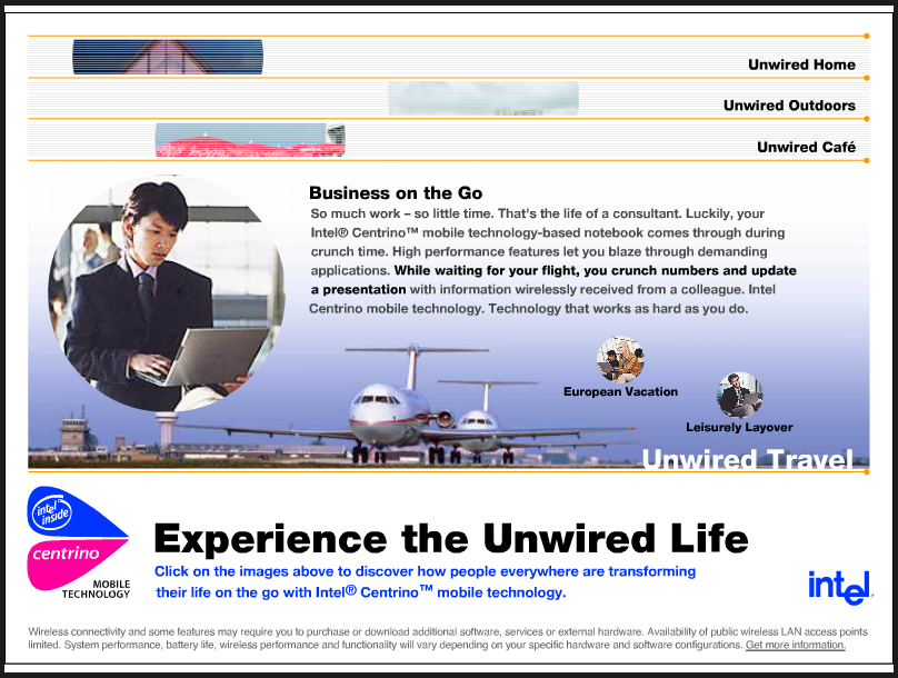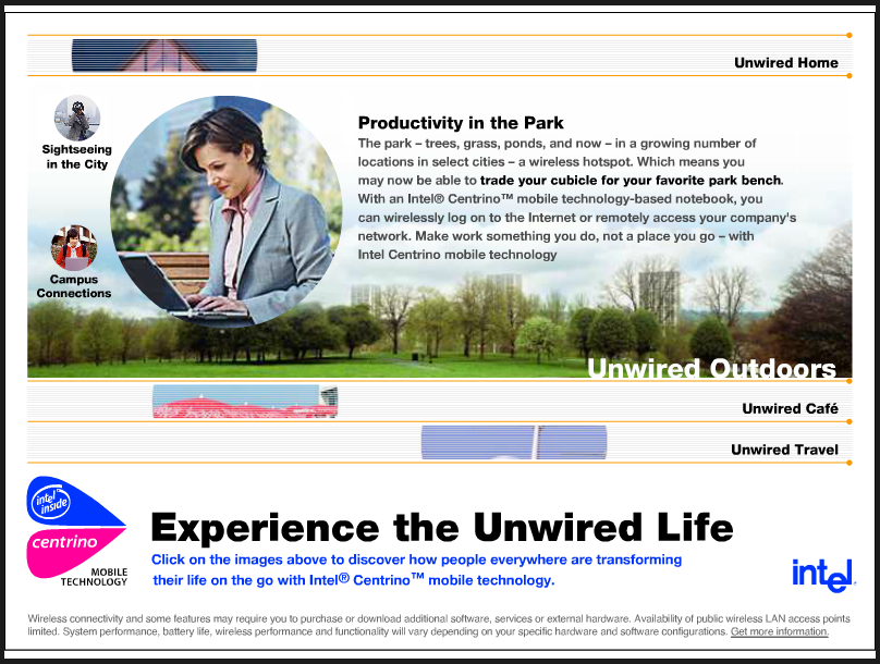 Intel Centrino mini-site featuring 12 aspirational vignettes that depict a cross-section of people enhancing personal productivity and their daily lives through wireless computing.