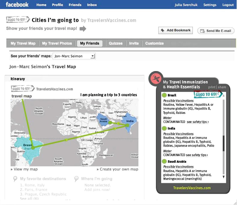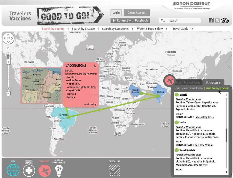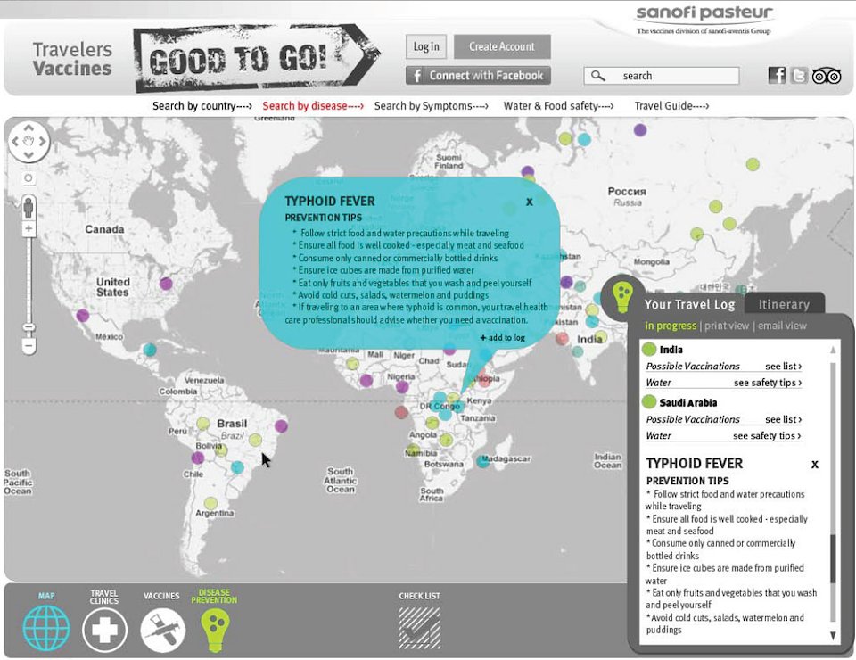 Travelers can click on different countries to learn about diseases they need to vaccinate against. They can then add that info to a log accessible from a mobile app.