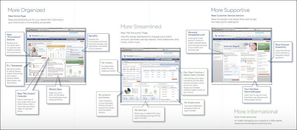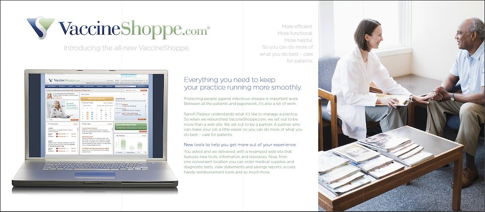 Brochure announcing the relaunch of VaccineShoppe.com to healthcare providers.