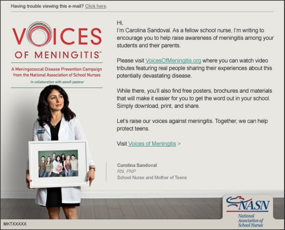 Email to school nurses on how they can help protect students from Meningitis.