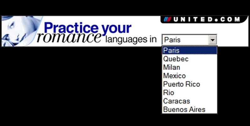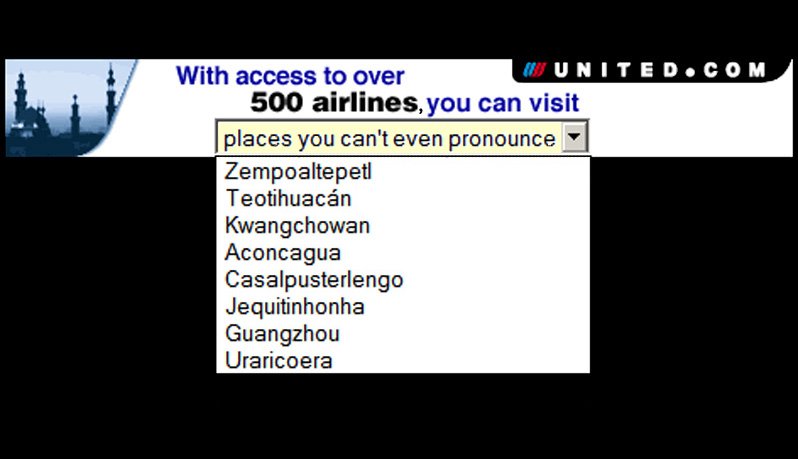 A way to show the breadth of places United flies to around the world. This banner ran more frequently around Valentine's Day.
