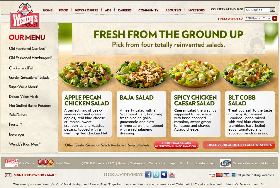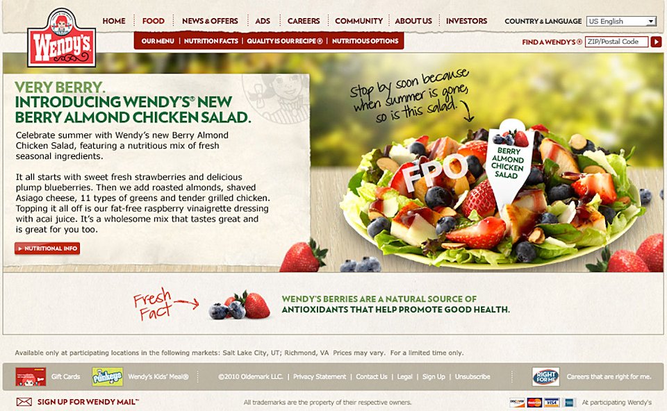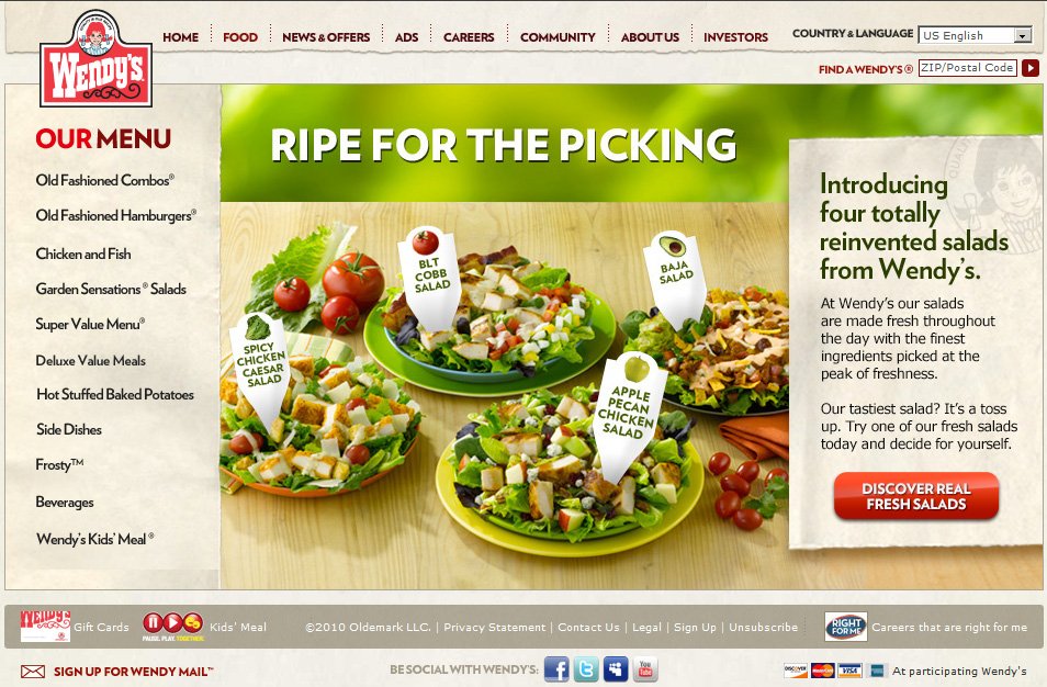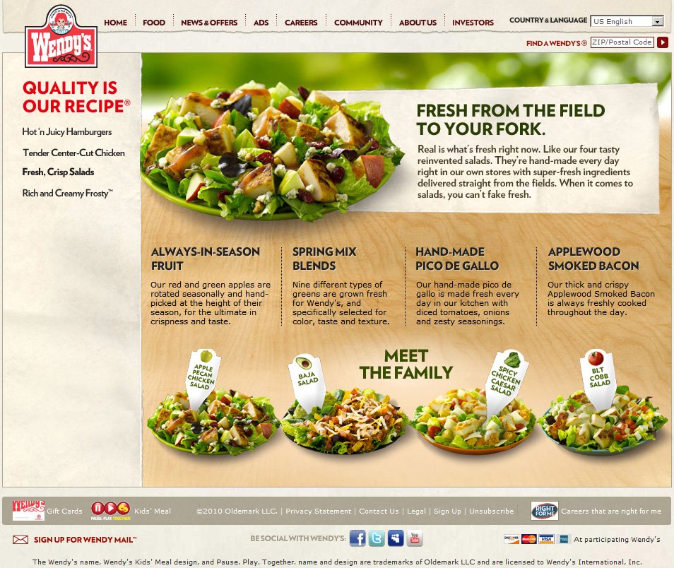 Wendy's salads menu landing page. Part of campaign that included web pages, emails, banners and online promos for Wendy's restaurant chain.