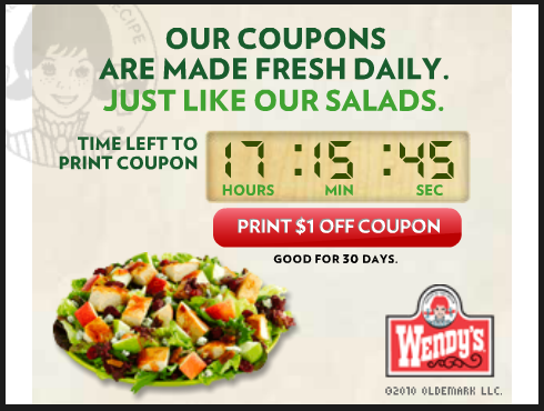 SOLUTION: Dramatize a sense of urgency with seconds clicking off a clock. Salads stay fresh only for so long. Same as this coupon offer.