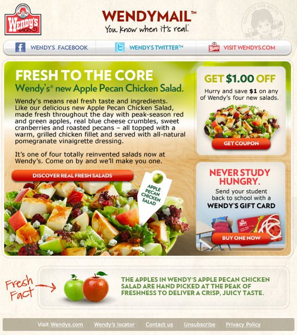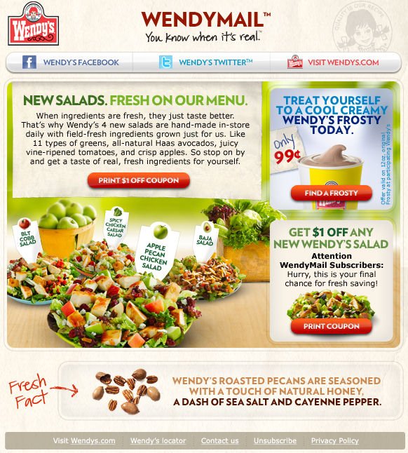 Email focusing on freshness, ingredients and preparation of Wendy's 4 new salads.