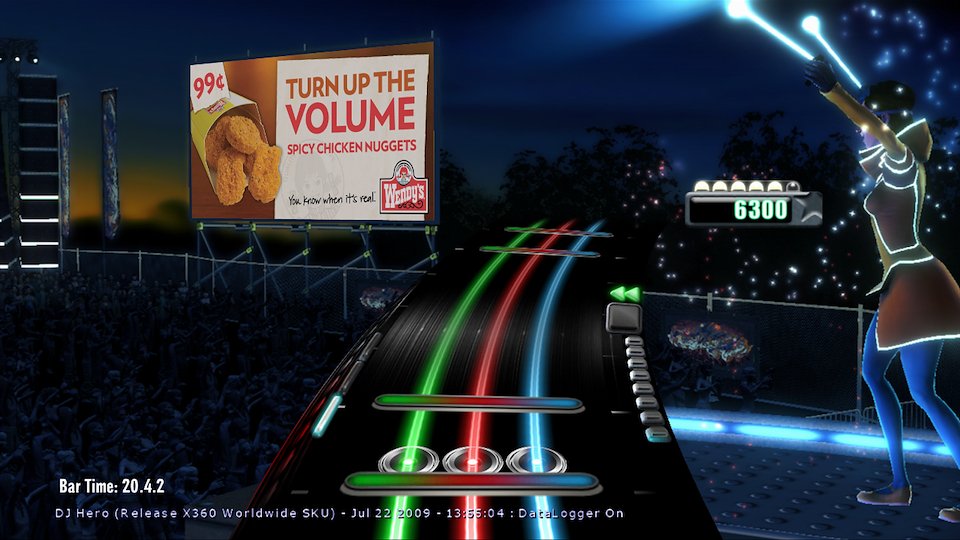 Contextual in-game ad for “Band Hero.” Objective: Reinforce that Wendy’s Spicy Chicken Nuggets are HOT!