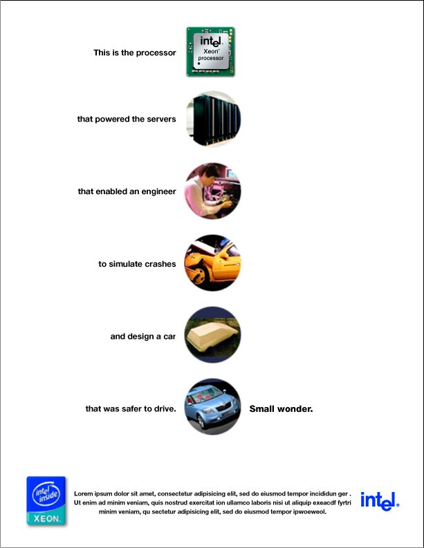 Strategy “Small Wonder”: Make tiny Intel microprocessors relevant to consumers by showing how they make a huge impact in people’s lives every day. (Exploratory campaign)