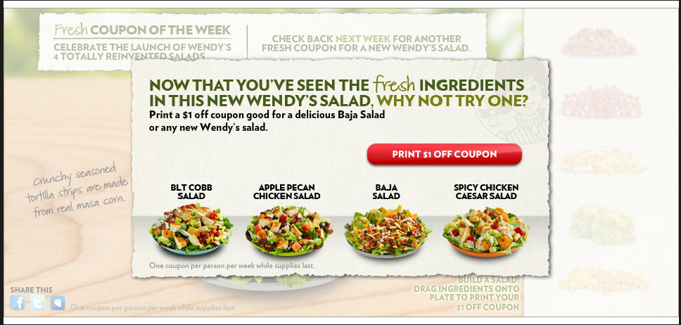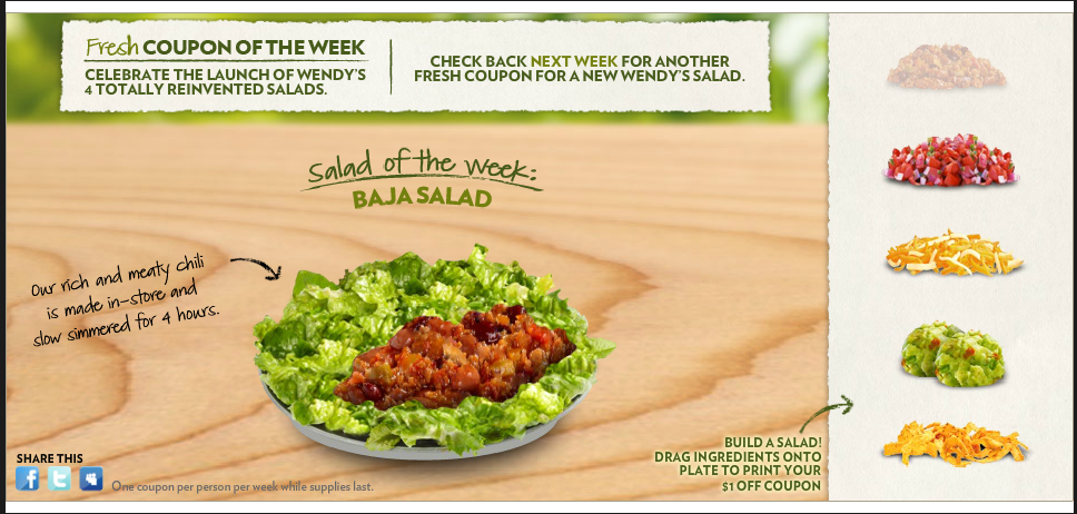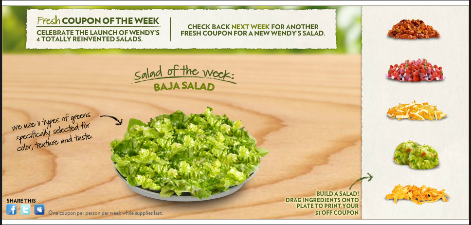 SOLUTION: Consumers learn about each salad ingredient as they drag them into the bowl. Once the salad is "built," the visitor is rewarded with the opportunity to print a coupon.