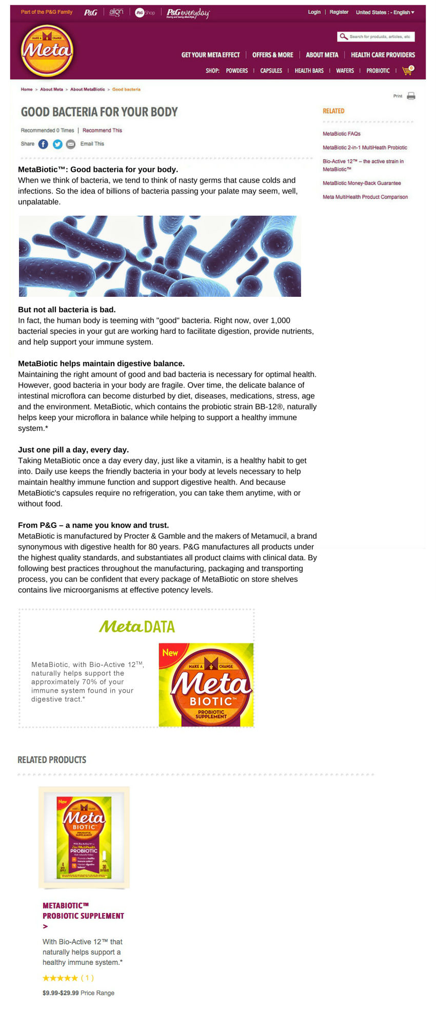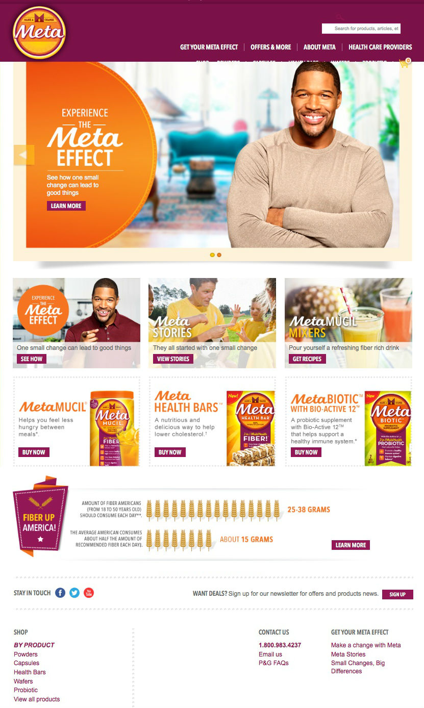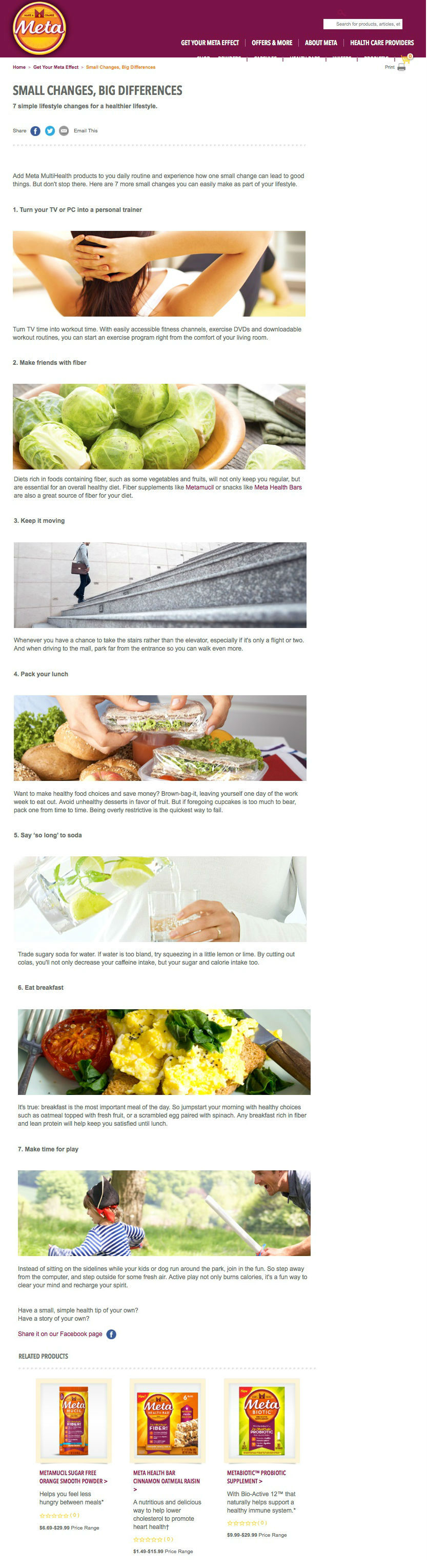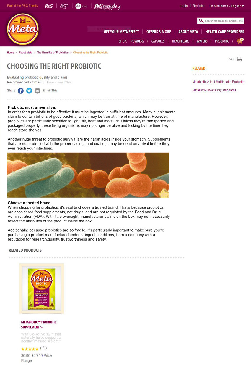 Spearheaded website content creation and copywriting for Meta – a new line of health and wellness products from Procter & Gamble. Worked with UX to identify relevant content and map out site structure and navigation. Established brand voice, wrote dozens of product descriptions and authored educational articles on digestive health.