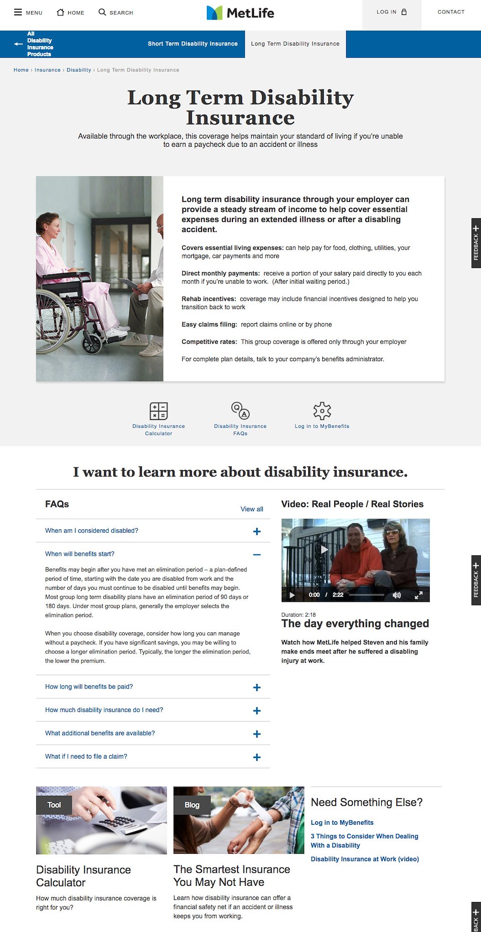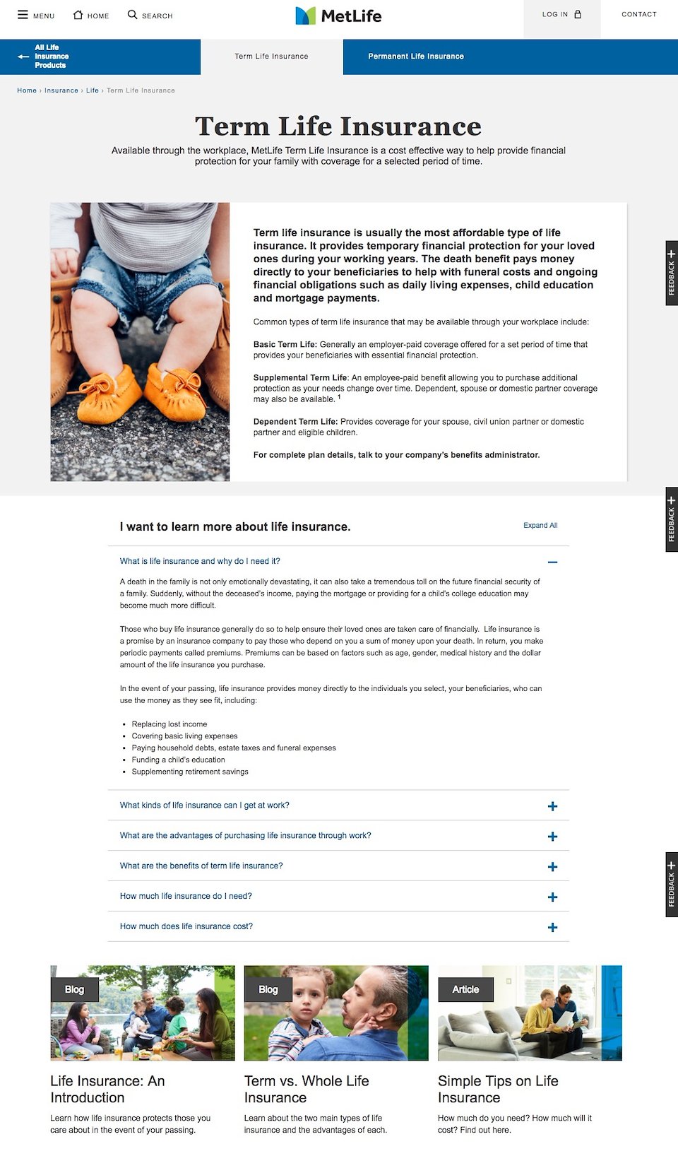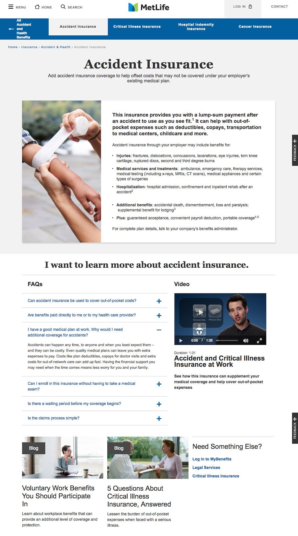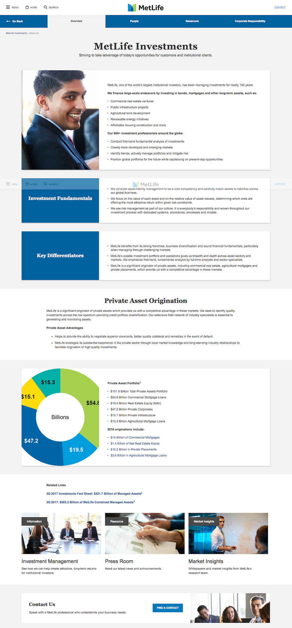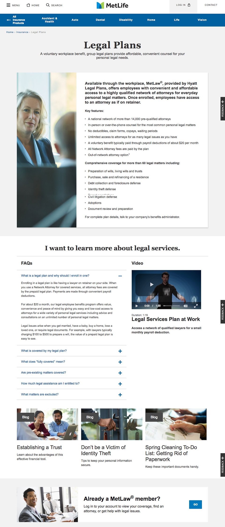 MetLife Global Brand Redesign. Developed online copy and content to increase engagement and drive enrollment in insurance products and institutional investments. Partnered with UX team to ensure new responsive “mobile-first” design templates supported content requirements.
