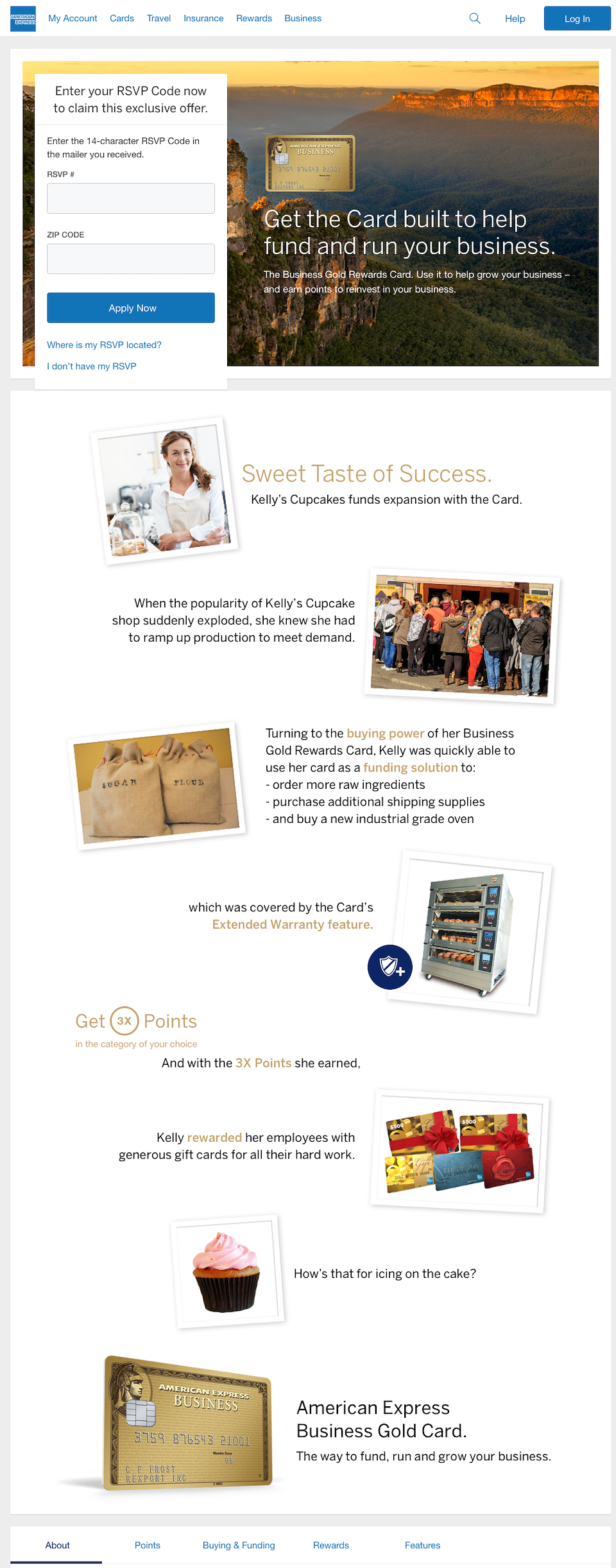 Business Gold Card landing page: A brief story that dramatizes how Kelly, the owner of a small cupcake shop, turns to her Business Gold Rewards Card to meet a sudden spike in demand. Using her Card, she purchases business supplies, has them covered by card benefits, and earns points to reward her employees. Clicking on the gold links opens windows with feature details.